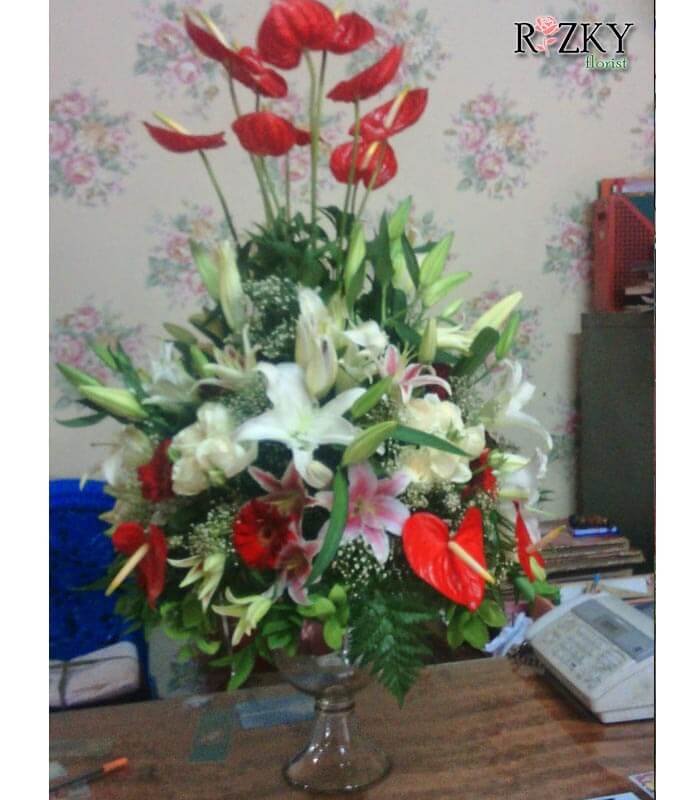 • Perpaduan warna bunga bisa disesuaikan dengan permintaan customer atau stok tersedia di florist